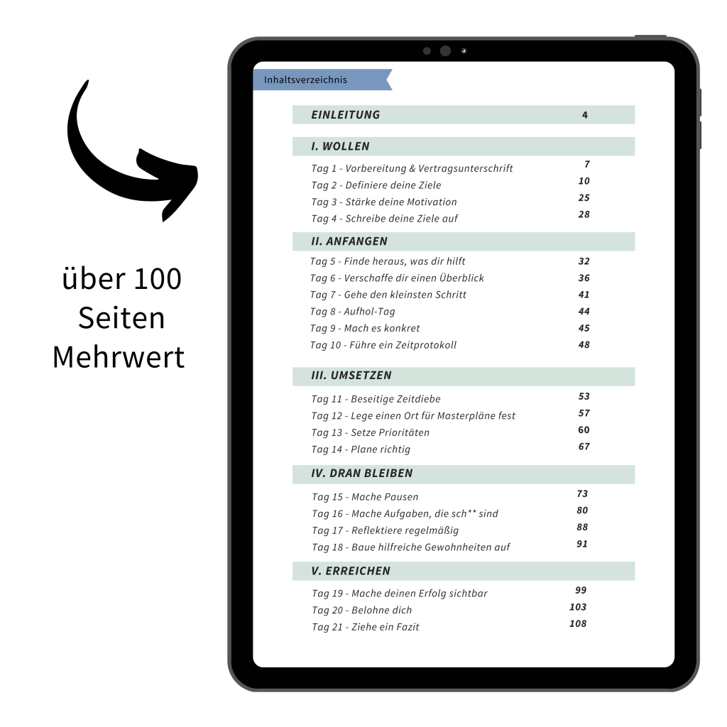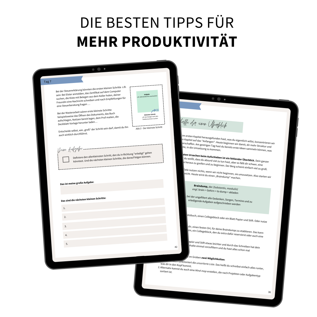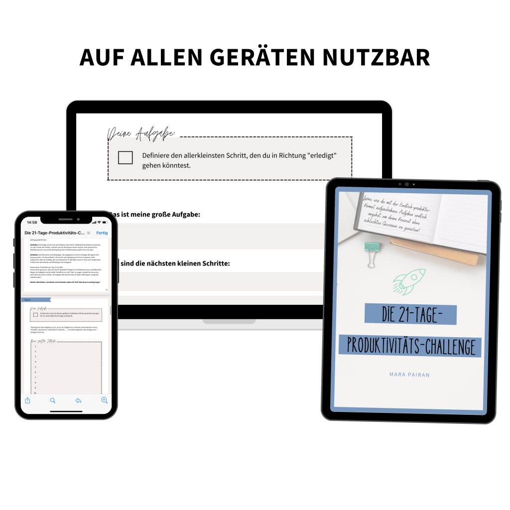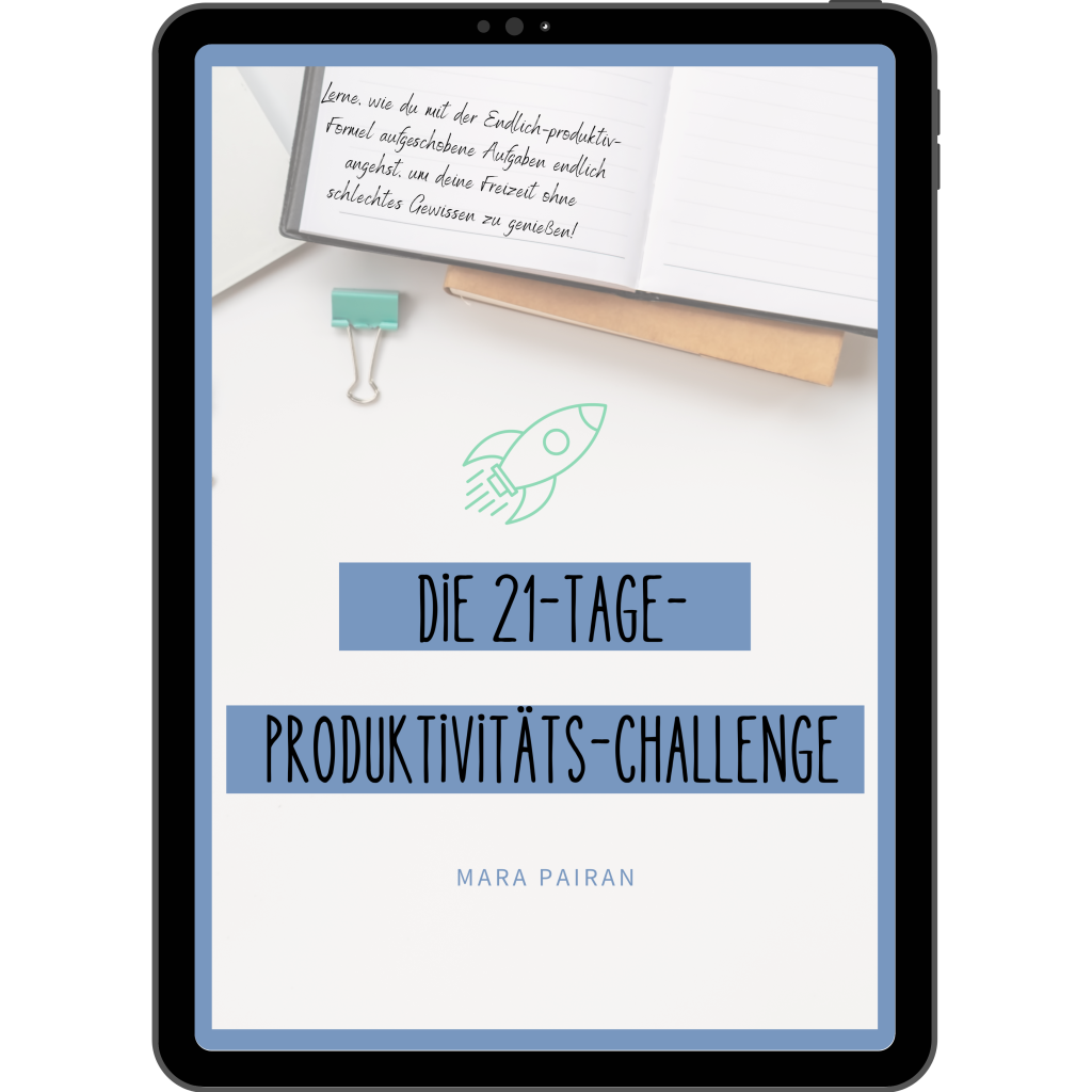 Wenn du dabei Hilfe brauchst, hol dir die 21-Tage-Produktivitäts-Challenge. Das ist ein Anti-Aufschiebe-E-Book, das dir hilft in 3 Wochen produktiver zu werden und endlich einen großen Haken hinter deine Aufgabe zu machen.