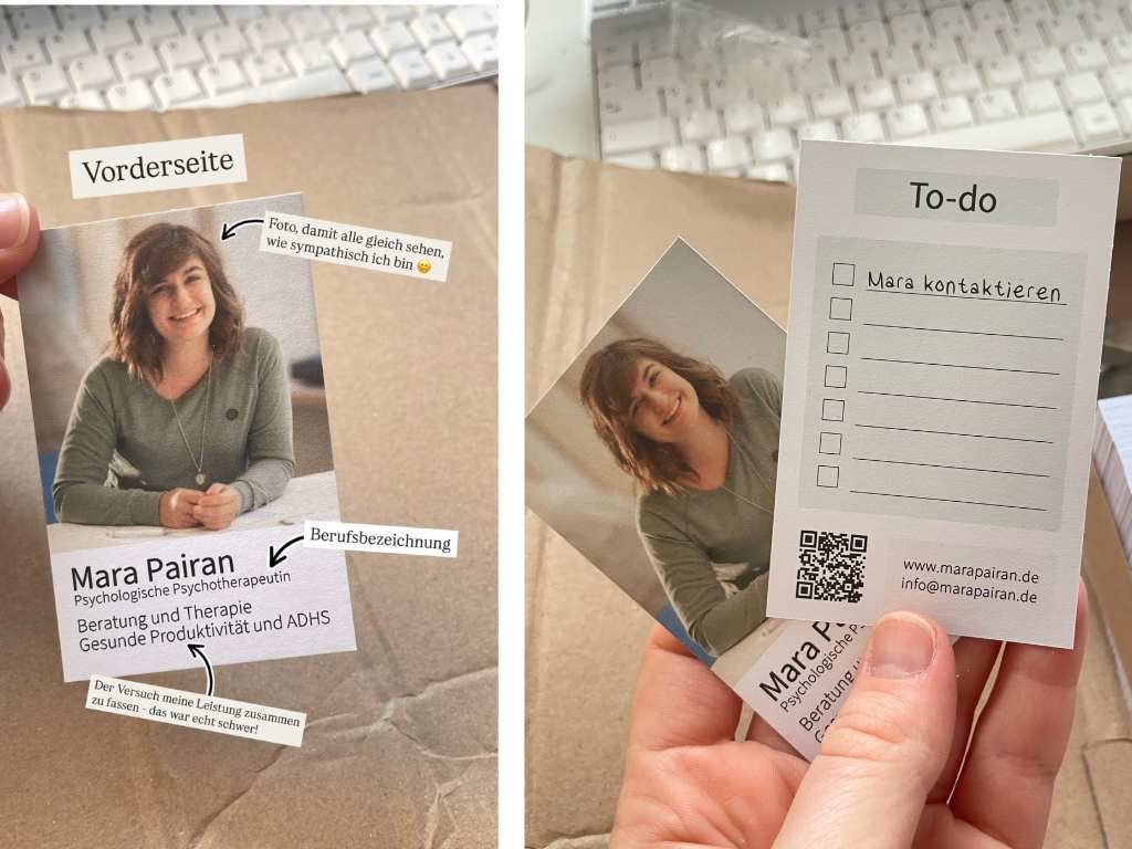 Für dieses Business-Event wollte ich unbedingt Visitenkarten haben. Außerdem glaube ich, dass sie sich extrem gut weiter reichen lassen und als kleine eigene Flyer funktionieren können. Zumindest meinen Erfolg bei der Suche nach Gruppenteilnehmer:innen würde ich anteilig auch auf diese hübschen Visitenkarten zurück führen.
